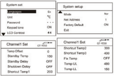 Easy temperature setting. Short press “MENU” to select setting channel, then press “UP”/“DOWN” key to adjust the temperature. Quick call short-cut temperature Short press “MENU” to select setting channel, then short press key 1/2/3 to quickly call the set temperature. Long press key 1/3 to turn on/off channel 1/2. User-friendly menu enables system setting easier. Support Chinese/English, / , Password, Keypad tone, Temp offset, Standby temperature, Standby/Shutdown delay, Shortcut/Fix temp, Ceiling/Lower limit temperature setting.